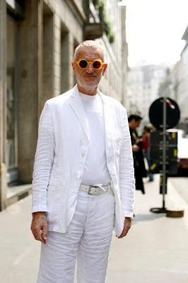A cream colored vest under a navy suit - one of those pleasant surprises I seem to keep seeing in Milan. This man is about 5' 4" and I would have thought that adding a contrast color vest would chop up his length too much but he looks great. I think it is because he has such a defined waist on the jacket.