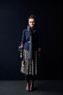 To a large degree this style was done in the late seventies. The long flowered skirt, the boots and scarf. However the gloves and the big glasses just bring it up to date. She looks charming and stylish. Great shot.