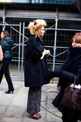 I was going to say silly hair but the front view shows very, very pretty tendrils at the side. It's just too high. Horrible shoe arrangement. Wonderful coat.