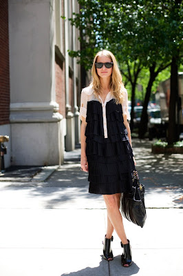 First picture: very high-end fashion, but for once, executed very stylishly. The lady has taste. And despite the black it is a summery look. The dress with pleats and the white shoulder/collar part is gorgeous. The shoes make the look rock.